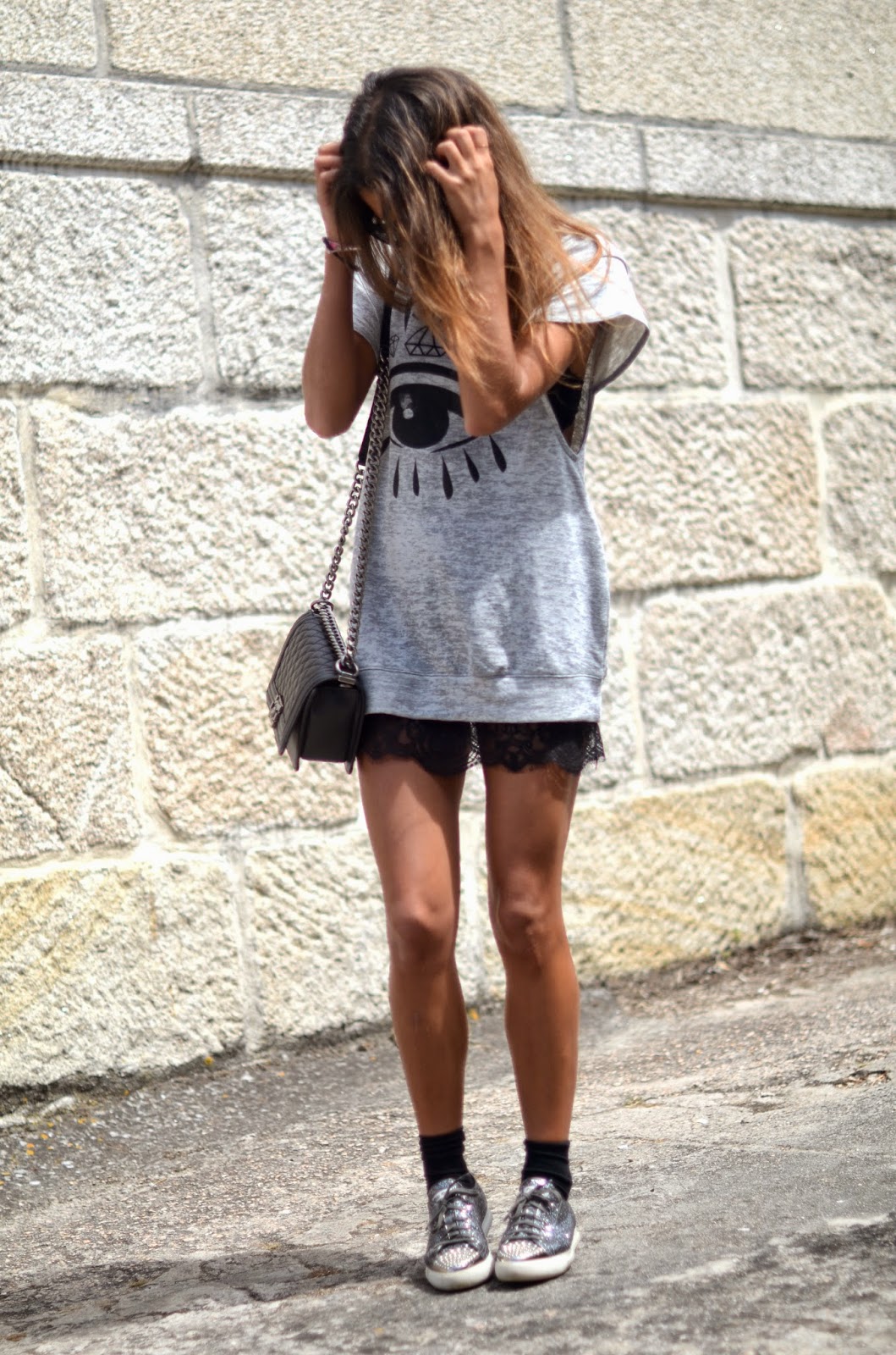 Y la falda de encaje por debajo, le da el contrapunto más femenino al look. Y con mis adoradas sneakers glitter como colofón del look :)