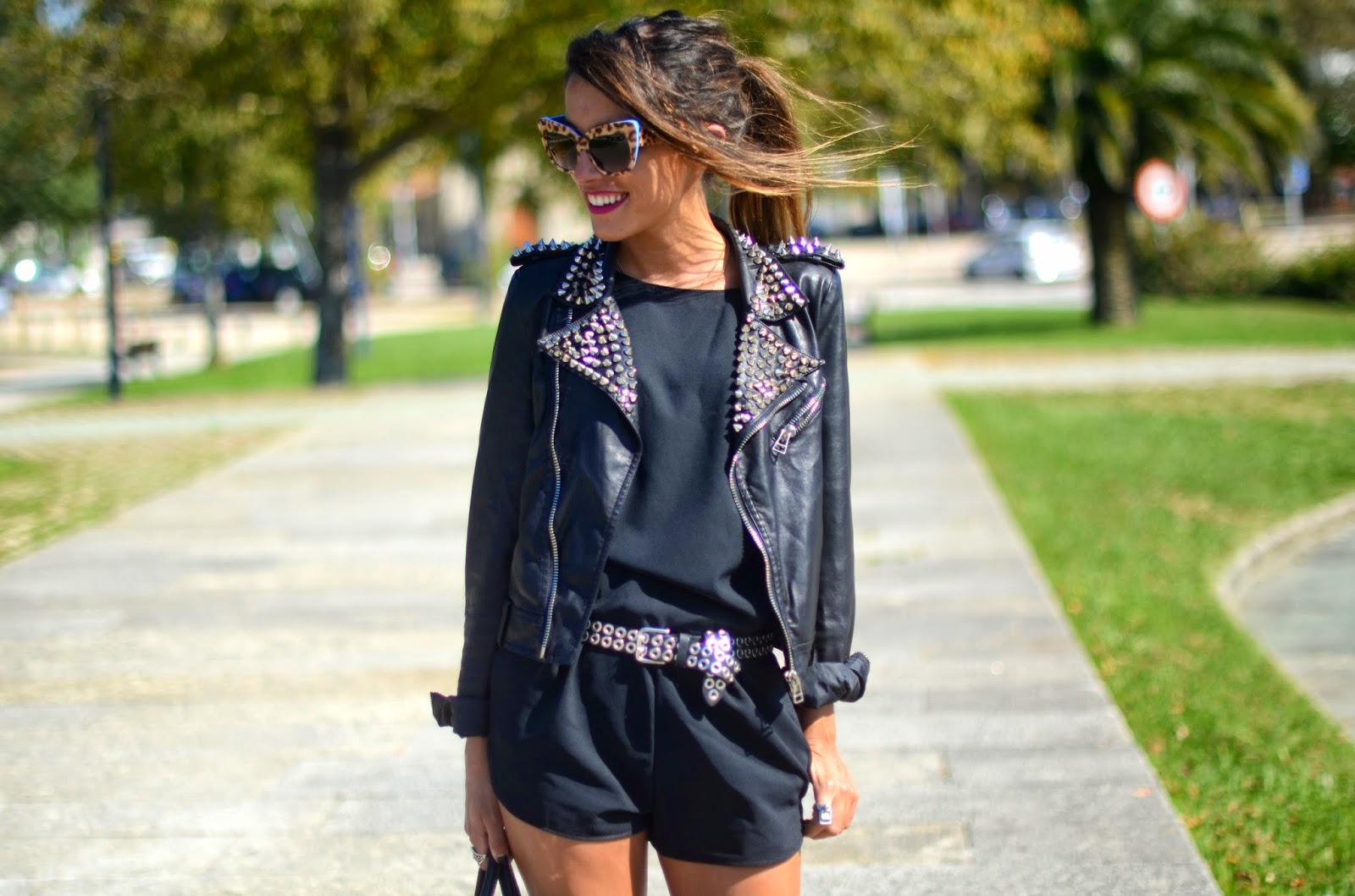 Y si a esto le añades una biker de cuero negra, botas de hebillas, y tachuelas... Muchas tachuelas! No podrás conseguir un look más rock. Es el estampado animal print de las maxi gafas, lo que pone el punto de color al look.